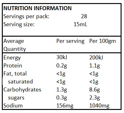Water, Vinegar, Red Chilli (4%), Starch, Apple Juice Concentrate, Garlic, Pink Himalayan Salt, Fermented Rice, Vegetable gum (xanthan gum), Natural colour (paprika oleoresins).