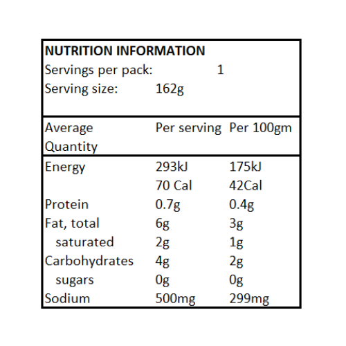Ingredients: KONJAC NOODLES: Water, Konjac powder, Citric Acid. SAUCE: Water, White sugar, Vegetable oil, Edible salt, Onion, garlic, Curry powder, Ginger, Tomato paste, Red sweet pepper powder, Yeast extract, Pepper powder, Spice (black pepper powder, onion powder), Edible essence, 5’- flavored nucleotide disodium, Citric acid. VEGETABLES: Onion, Carrot.